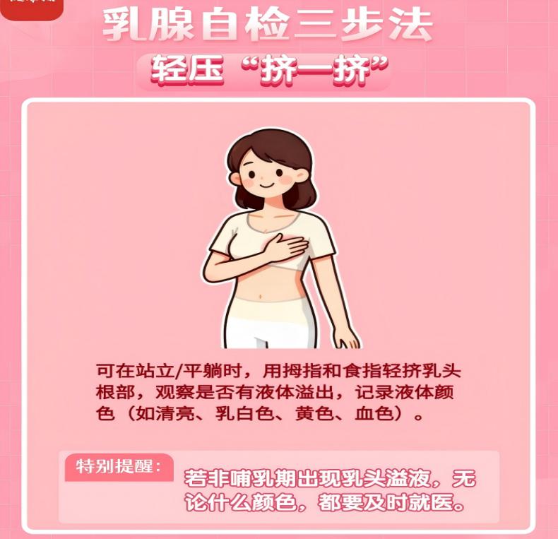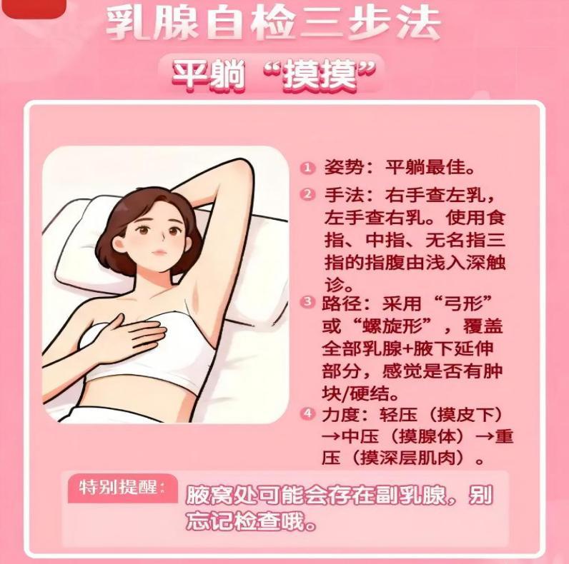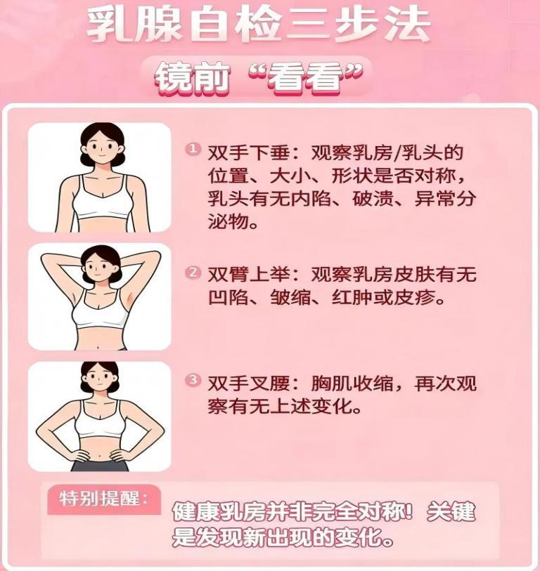 ①乳腺自查:每月1次,建议在月经结束后7–10天进行