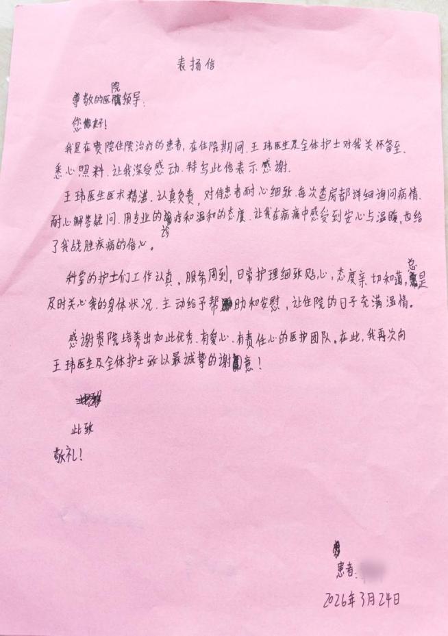 治疗过程中,王玮医生认真负责、诊疗细致,护理团队贴心照料、主动关怀,用耐心与陪伴缓解患者的焦虑情绪。患者深受感动,亲笔写下感谢信,致敬科室全体医护人员的用心付出。