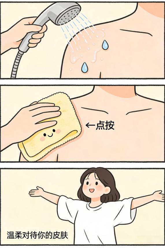 ②用32–34℃温水轻柔冲洗,不用肥皂、沐浴露、酒精、碘伏、香水等刺激性物品。