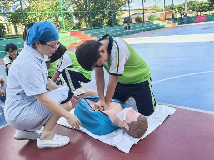 首先,由急诊急救医护专家团队(共15人)于篮球场开展了急救技能培训。活动内容包括AED(自动体外除颤仪)使用、心肺复苏术、“海姆立克”急救法及溺水抢救的实操演示与一对一指导,现场互动热烈。本次活动共吸引200余名师生参加,有效提升了学校的院前应急抢救能力。