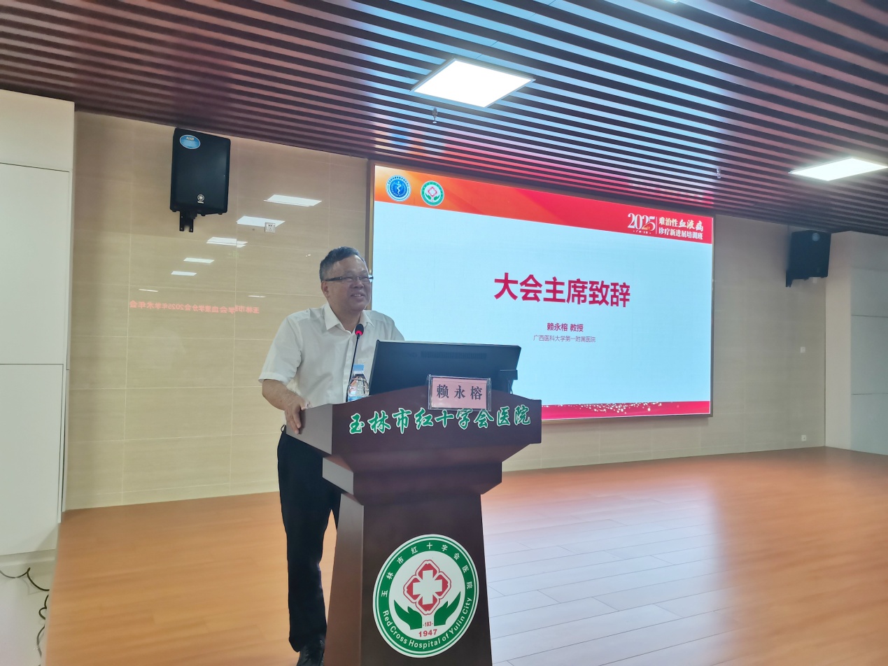广西医学会血液病分会主任委员赖永榕在开幕式上致辞。他充分肯定了玉林市红十字医院血液内科近年来在学科建设、技术推广和人才培养等方面取得的成就。他强调,血液系统疾病诊疗技术的不断更新对临床工作具有重要意义,并希望与会人员借此平台深入交流,共同推动桂东南地区血液病学科发展。