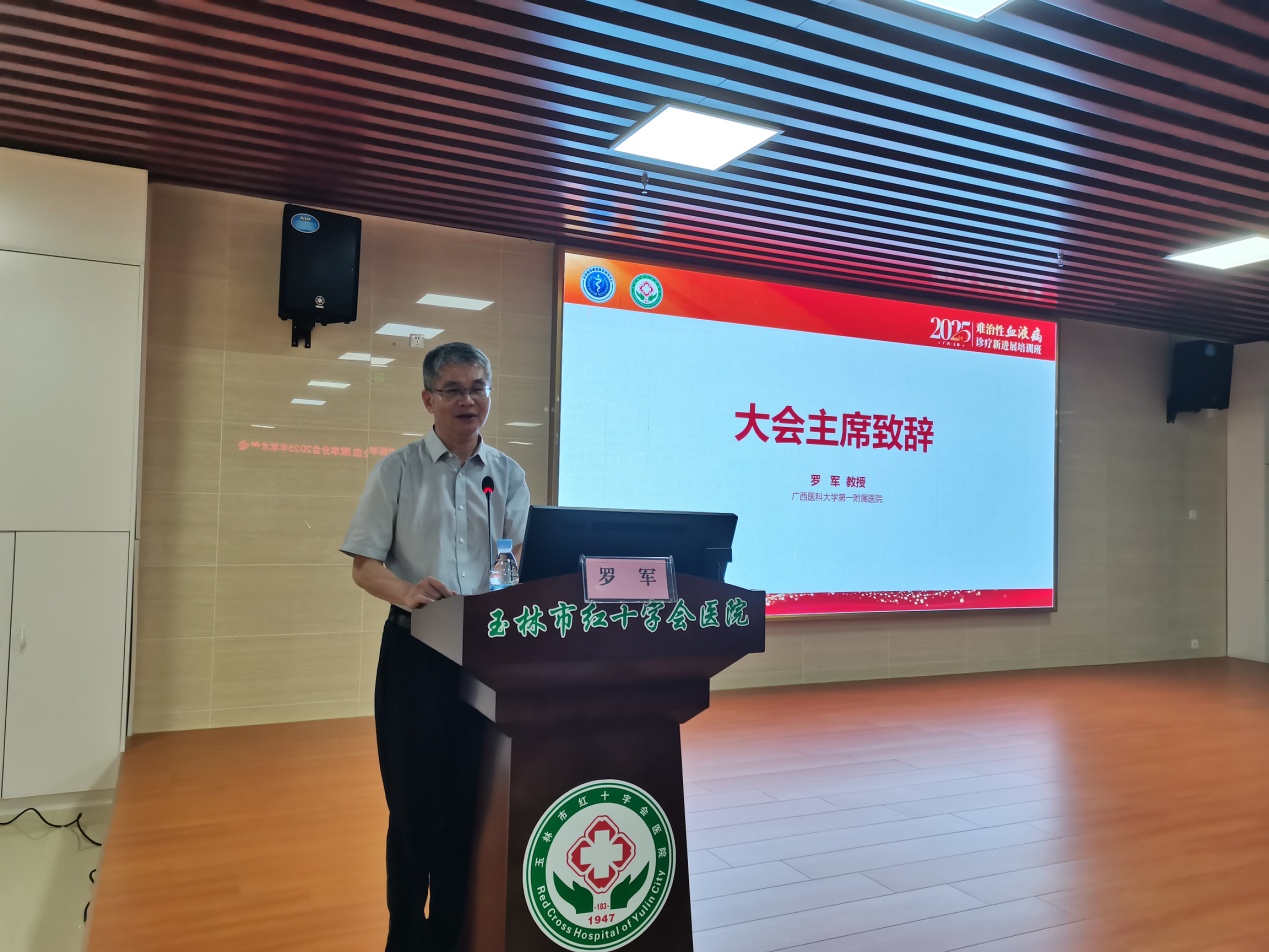广西医师协会血液学分会主任委员罗军教授致辞。他指出随着人口老龄化和疾病谱的变化,血液系统疾病发病率逐年上升,血液科医师肩负的责任重大。他呼吁与会者珍惜此次学习机会,将新技术、新理念应用到临床实践中,规范血液系统疾病诊疗,为更多患者带来健康福祉。
