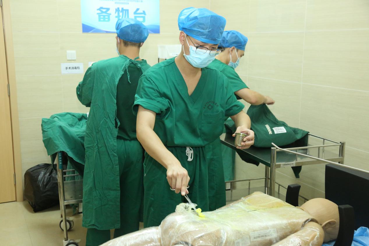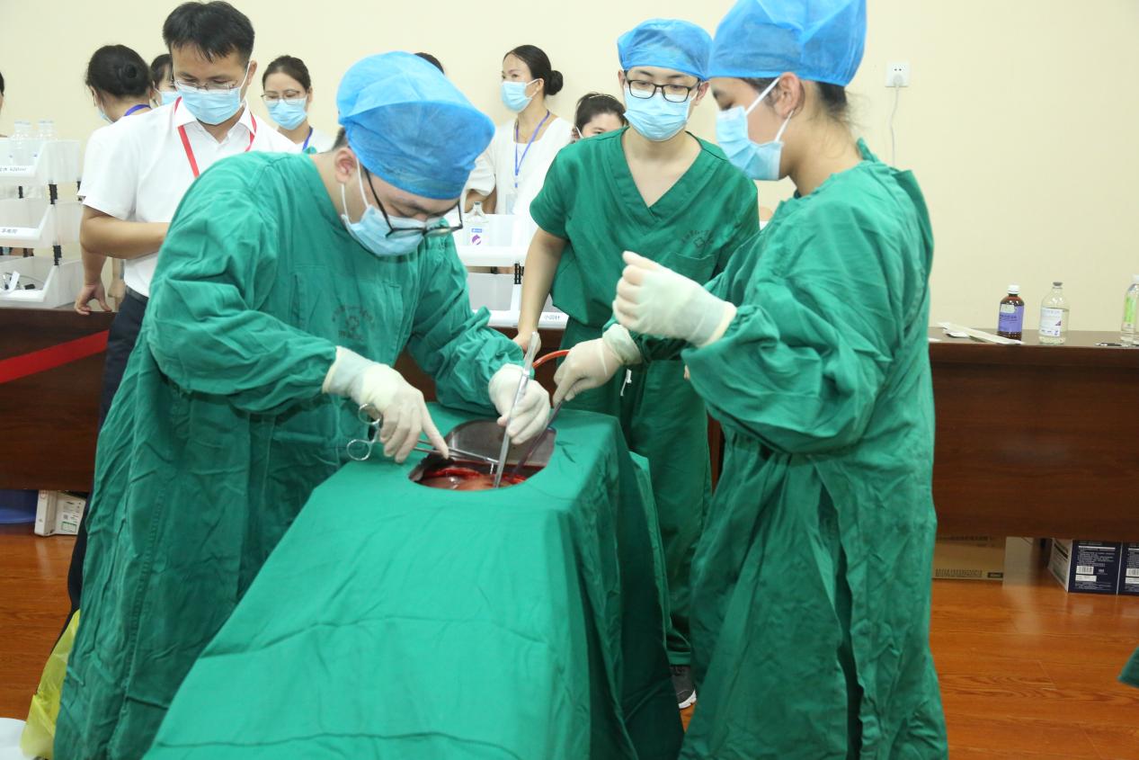 决赛环节则聚焦“全流程应急处置”,以“自然灾害现场急救—外伤休克接诊—肝脏缝合”连贯病例为考核内容。选手需在模拟灾害场景中规范完成脊柱损伤患者徒手搬运,为休克病人紧急开通静脉通路,在穿戴式腹穿模型上完成诊断性腹穿,最终在动物器官上精准开展肝脏破裂缝合操作,整个过程不仅考验单人技术水平,更注重团队协作能力,充分还原临床急危重症救治场景。