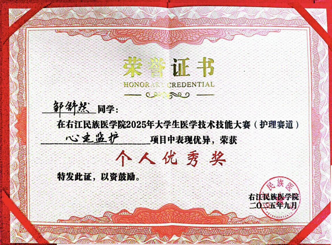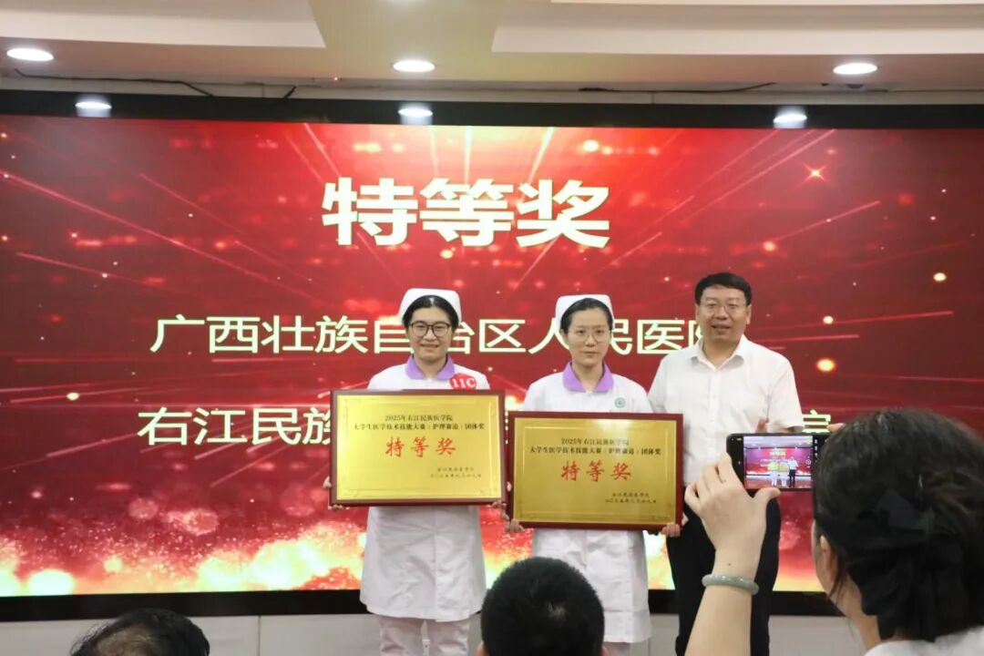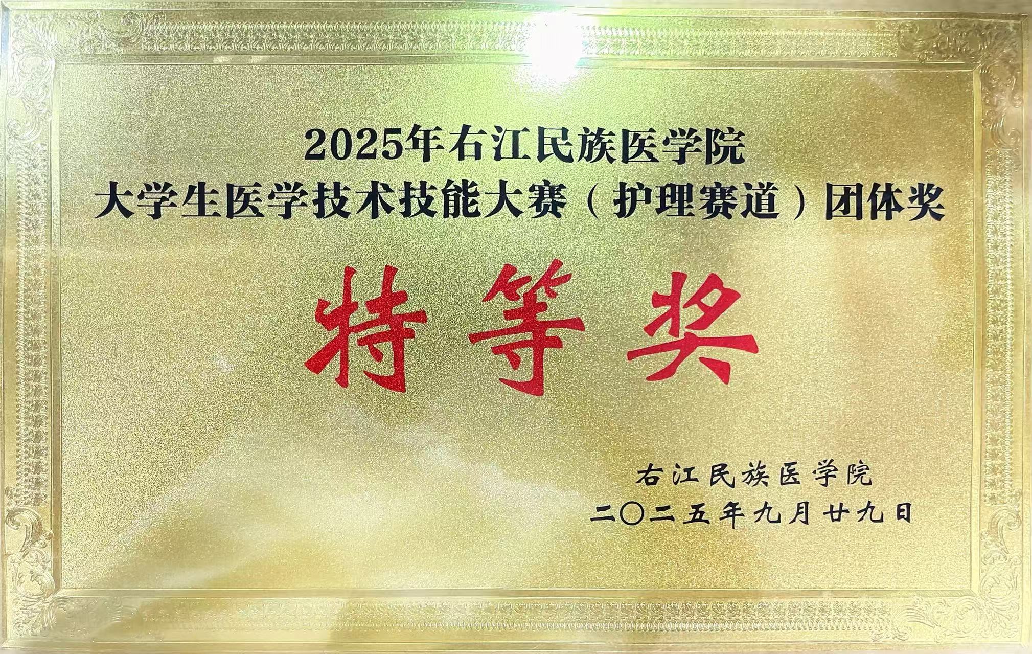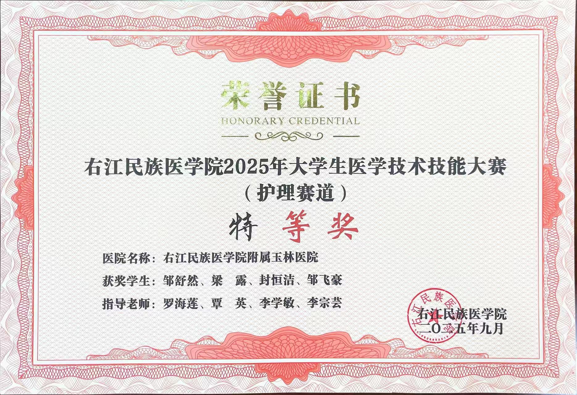 2025年9月29日,由右江民族医学院护理学院主办、玉林市妇幼保健院承办的右江民族医学院2025年大学生医学技术技能大赛(护理赛道)决赛在玉林举行,由玉林市红十字会医院选派的4名优秀的实习生组成的参赛团队,凭借扎实的理论基础、熟练的临床操作技术和沉稳的应急处置能力,从36支区内外参加初赛队伍中脱颖而出,以第13名的成绩晋级决赛,并最终荣获团体特等奖,其中一名选手荣获个人优秀奖。