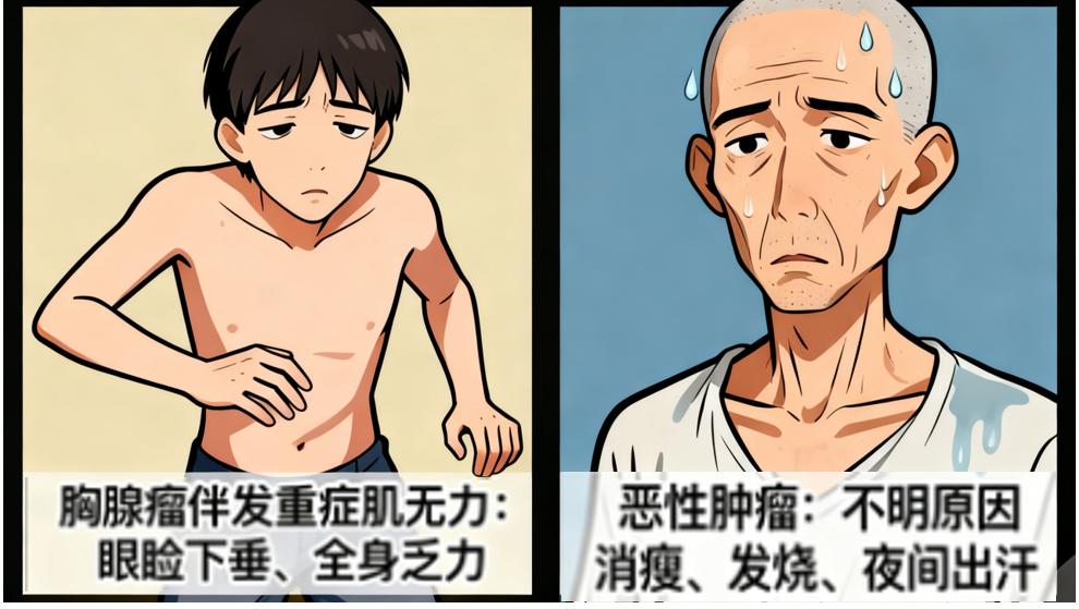 5.带着“特殊技能”:有些叫“胸腺瘤”的肿瘤,会让人眼皮抬不起来、浑身没劲儿,连走路都没力气(伴发了重症肌无力)。如果是不好的肿瘤,还会让人没缘由地瘦下来、老发烧、夜里睡觉一身大汗。