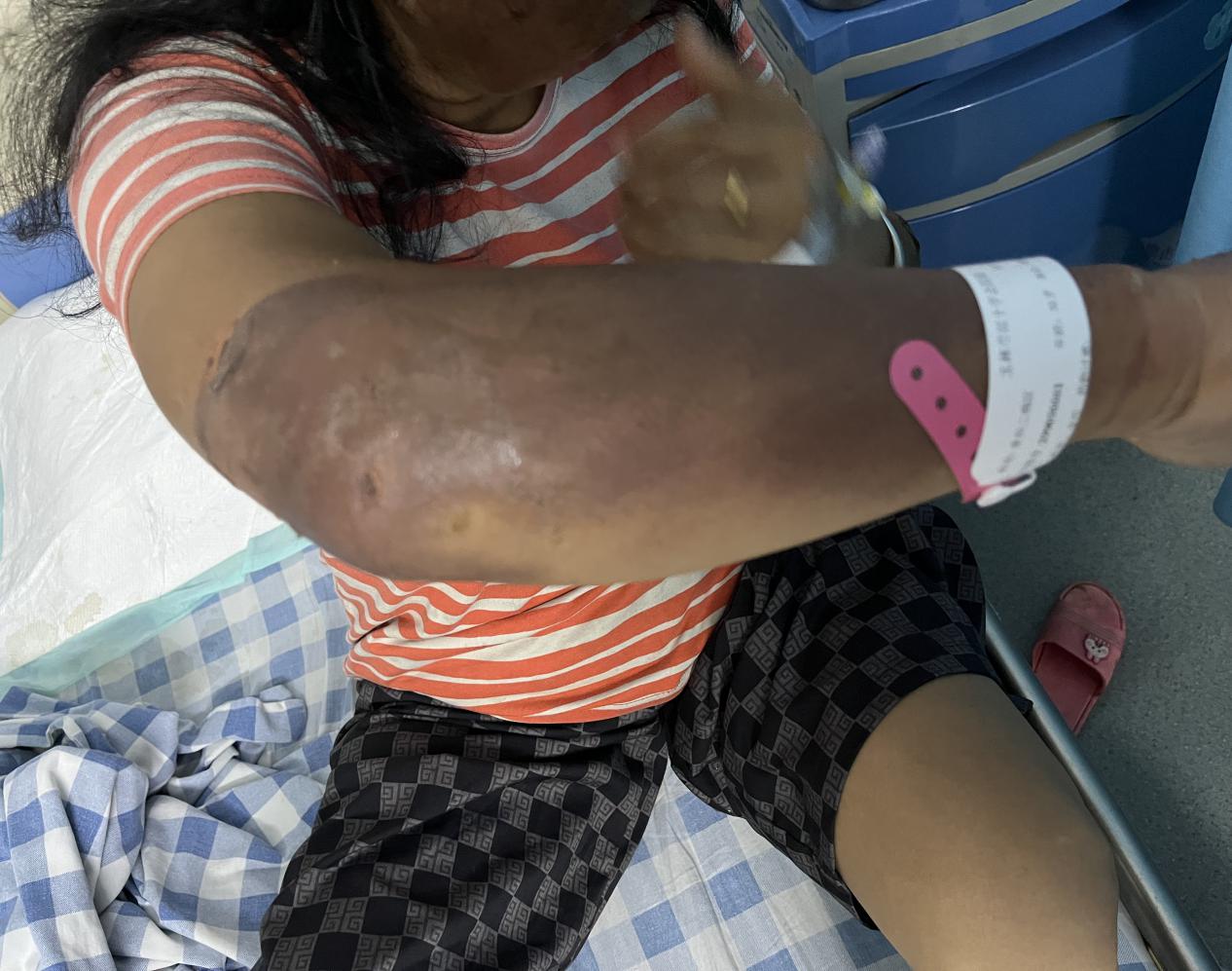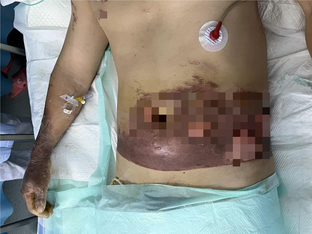 患者入院后,经检查,陈先生全身多处二度烧伤(腹部、双上肢10%二度烧伤),多处一度烧伤(头面部、四肢25%一度烧伤);叶女士左上肢5%二度烧伤,全身多处一度烧伤(四肢末梢10%一度烧伤)。骨科二区医护人员立即启动创伤急救流程快速建立静脉通道,补充大量液体,防止烧伤后休克;同时予以清创、包扎伤口,预防感染。通过抗感染治疗、多次清创换药、营养支持疼痛管理,患者的病情趋稳定。